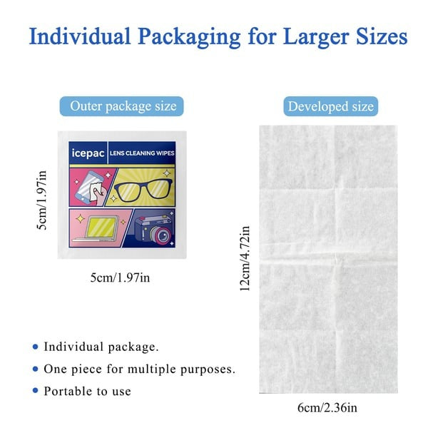 Gentle & Non-Irritating:Formulated with mild ingredients, our wipes are free from artificial colors, and fragrances, making them suitable for all skin types, including sensitive ones. They won't harm your lens surface or cause skin irritation.Our eye glass lens cleaner wipes are suitable for coated lenses, making them ideal for most optical applications. The lens wipes are big enough to be used as optical screen wipes and are made of soft, lightweight material that's gentle but effective.